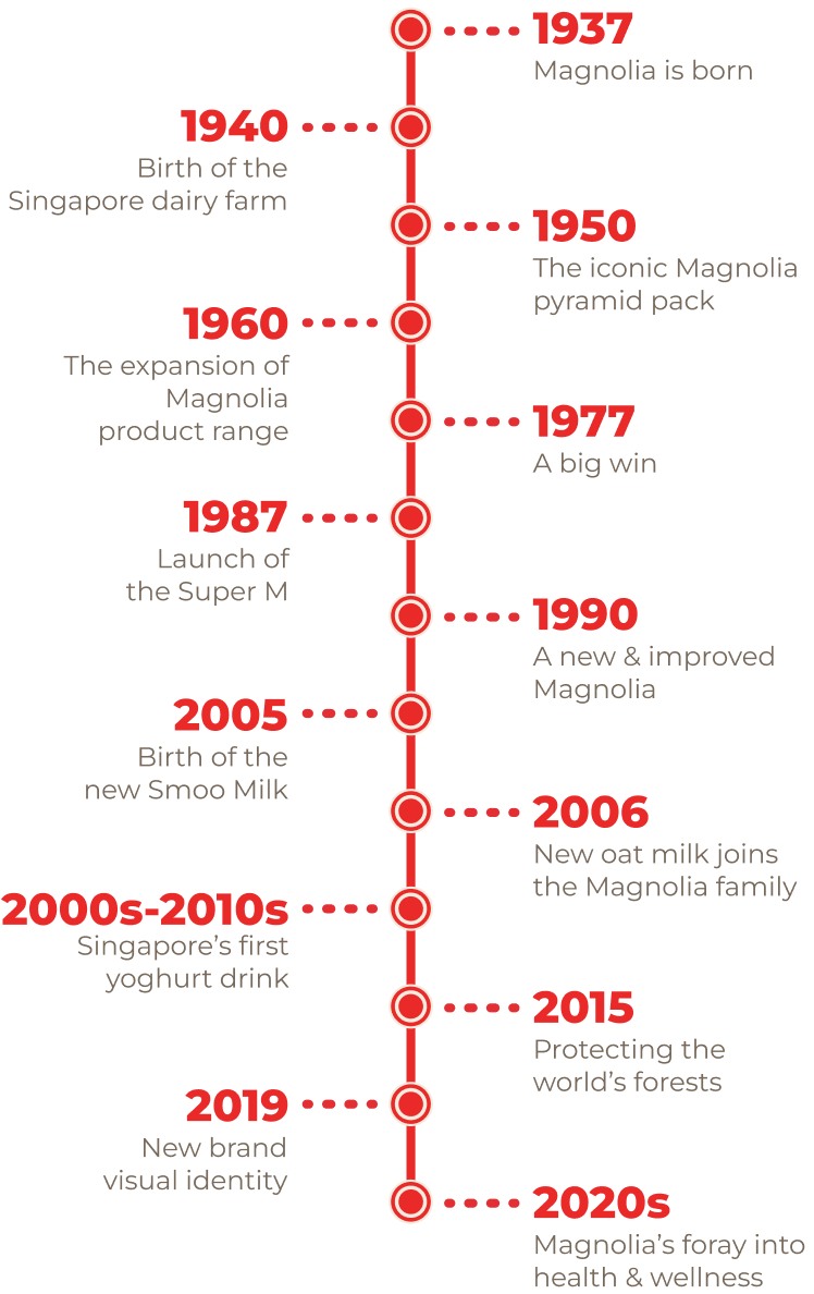 In 1964, Magnolia was granted pioneer status by Singapore’s government to produce sterilised milk. Bottled milk and condensed milk were then introduced into Magnolia’s Portfolio.